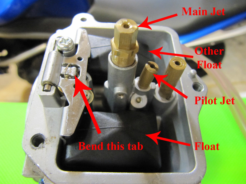 Bend the tab at the rear of the float pivot using the needle-nose pliers. Most vintage OEM Mikuni round-slide carbs have a pair of bronze-alloy floats soldered to a float arm. The fuel level is adjusted by BENDING the SMALL TAB that actuates the inlet valve.