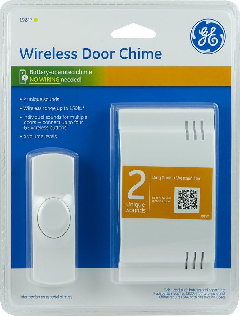 GE 19299 8-melody Plug-in Door Chime With Push Button. A basic wireless doorbell that requires 3-AA batteries for the chime unit not included and a CR2032 battery for the button supposed to be included but it. Classic Style Match your outdoor home dcor with a classic doorbell look that comes in white.