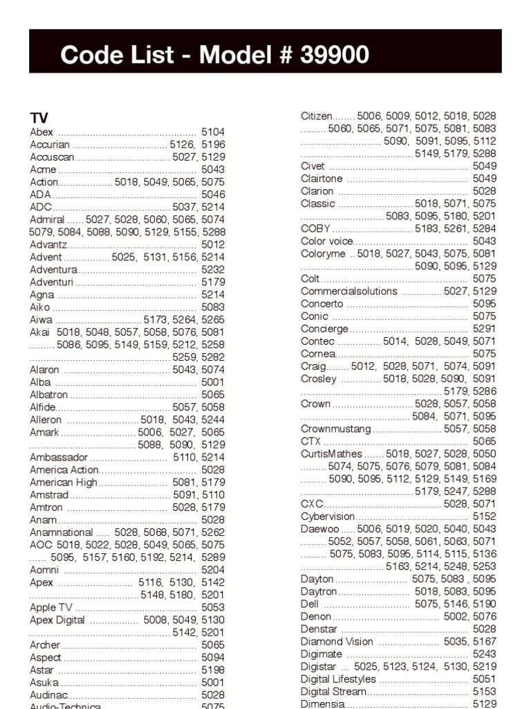 Code List Model 39900 Onn Universal Remote Support