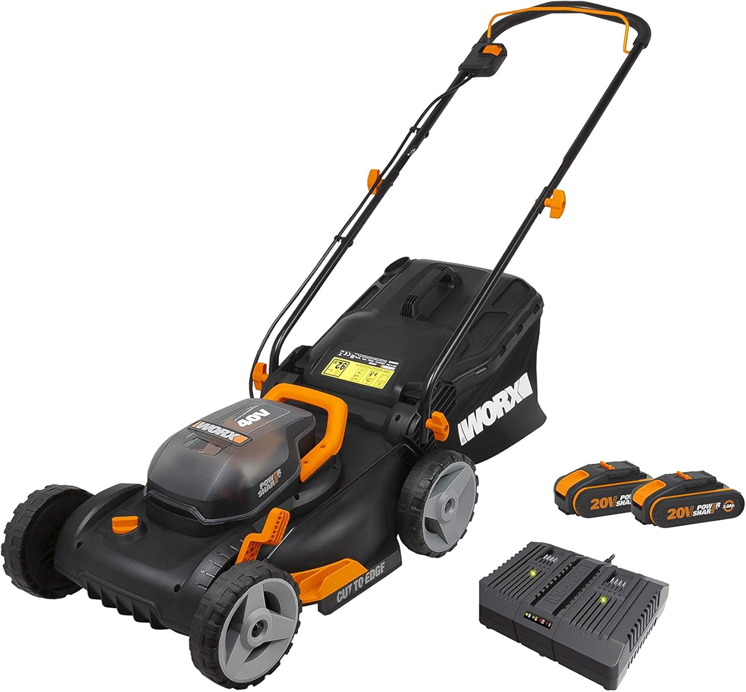 Dual 40 Ah Power Share batteries team up for 40V total power and performance and can be used on your other Worx 20V tools. Dual-port charger charges both batteries faster. Always charge the mower in a dry area protected from the weather.